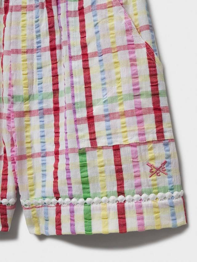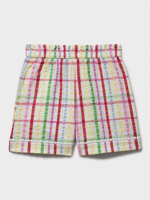 Белые шорты из хлопкового сирсакера. Эти невероятно мягкие шорты с рисунком в пастельную клетку и отделкой из кружева в стиле ступенек — милый и удобный дизайн, который обязательно понравится вашим малышам. Талия на резинке для удобства при одевании, а боковые карманы идеально подходят для хранения маленьких сокровищ.
