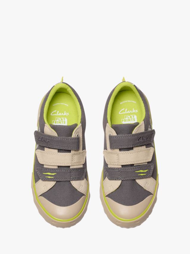 Серый хлопковый парусиновый верх и тройной ремешок с липкой лентой обеспечивают комфорт и безопасность вашим ножкам, а резиновый бампер защищает маленькие пальчики! Вдохновленные классным дизайном Clarks Rex, шипы в виде динозавров на пятке и изображение скелета мгновенно подготовят малышей к любым приключениям: от игр в саду до семейного парка.