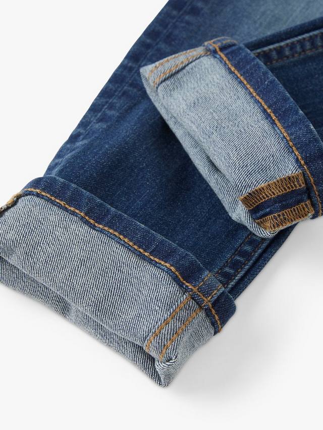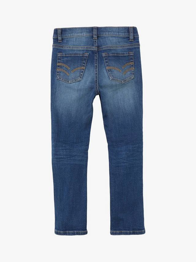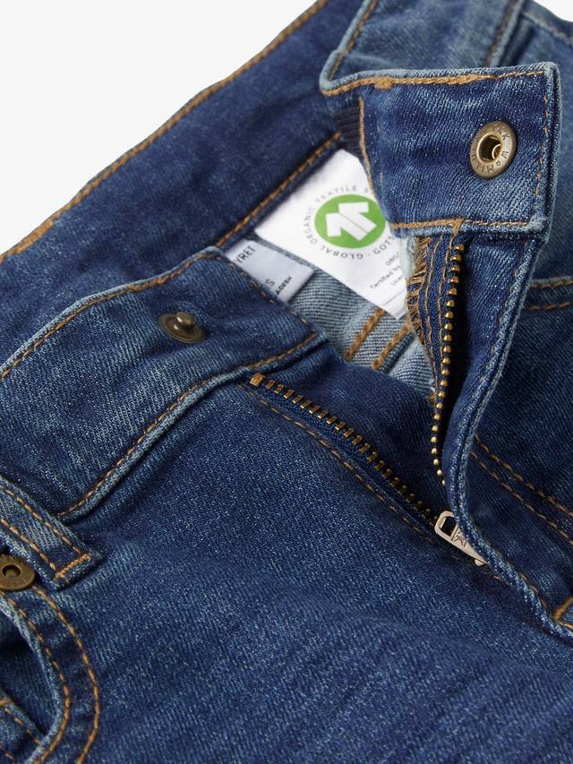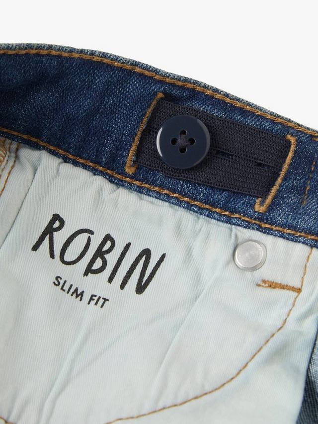 Узкие джинсы из эластичной хлопковой ткани для комфортной посадки. Регулируемый эластичный пояс с петлями и застежка на кнопку и молнию.