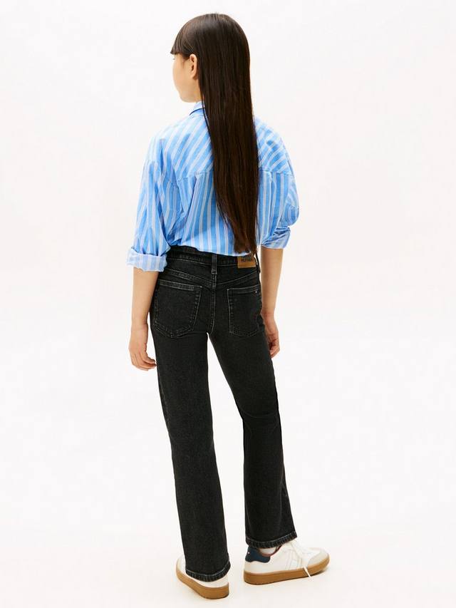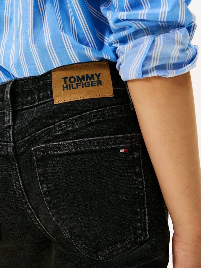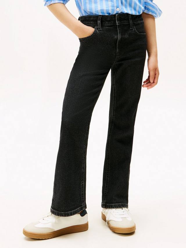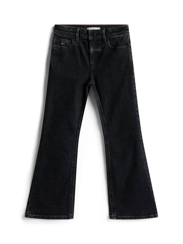 Эти расклешенные джинсы из черного денима, подходящие для школы или светских мероприятий, добавят винтажный штрих к любому образу. Изготовленные из эластичной хлопковой смеси, они застегиваются на молнию и пуговицы, имеют пять карманов и вышитый флаг Tommy Hilfiger на карманах для мелочи и задних карманах.