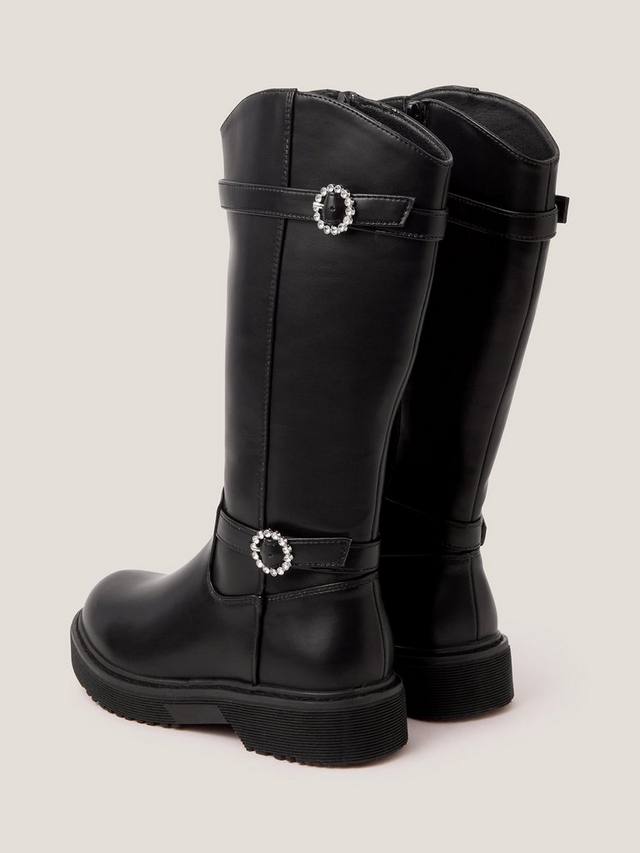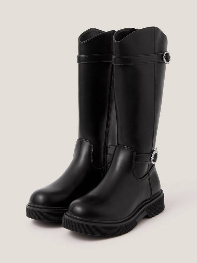 Эти сапоги, которые можно носить с элегантными мини-юбками или заправлять в джинсы, станут стильным дополнением к гардеробу для холодной погоды. Они изготовлены из гладкой искусственной кожи и украшены блестящими пряжками со стразами на щиколотках. Застегиваются на внутреннюю молнию.