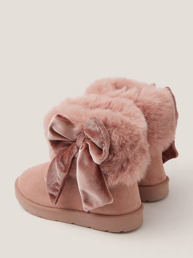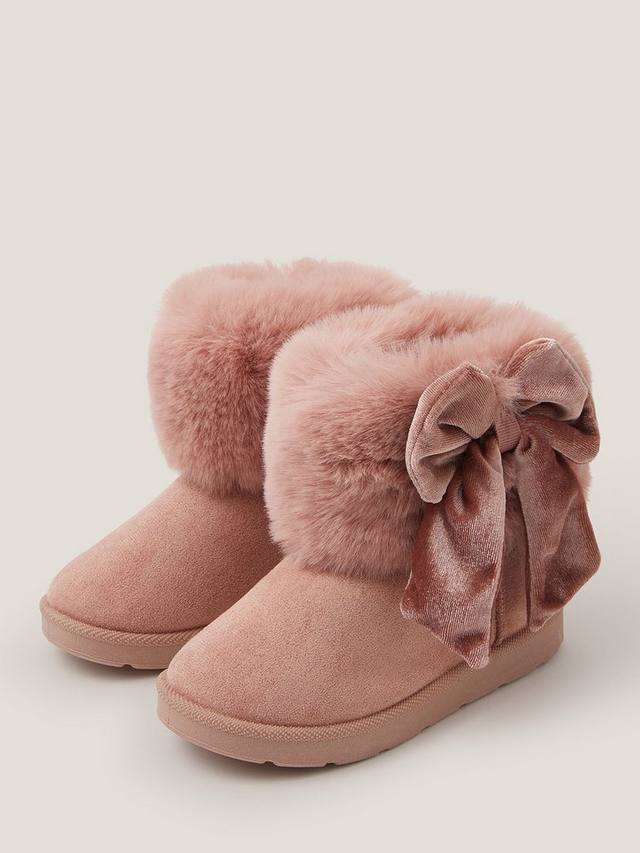 Согрейте маленькие ножки в тепле и уюте в любое время года. Эти ботинки из мягкой замши с манжетами из искусственного меха украшены бархатным бантом сбоку.