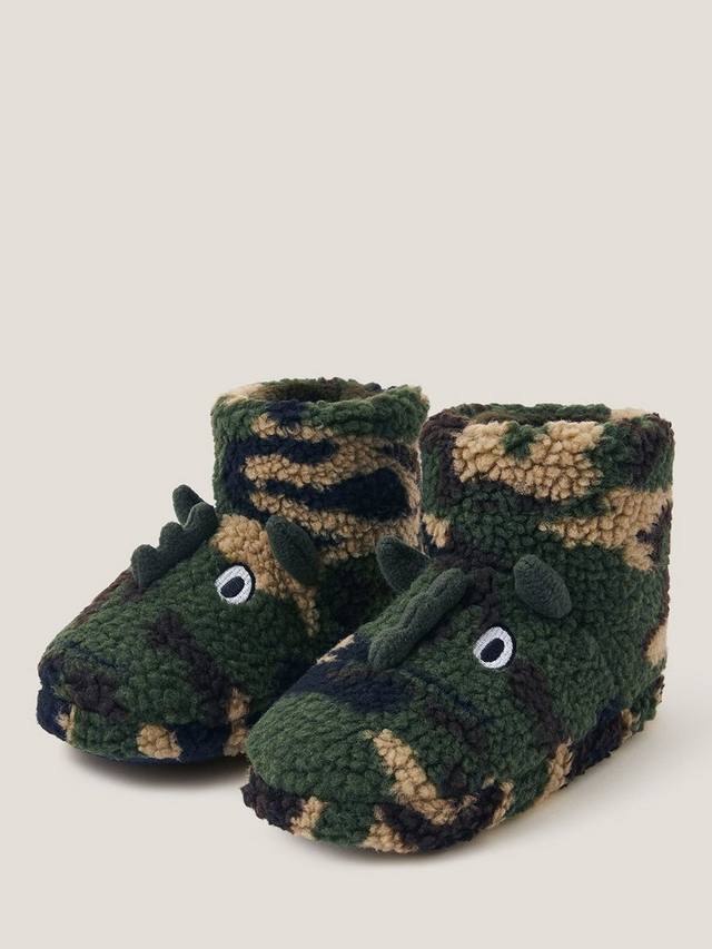 Уютное дополнение к их ритуалу перед сном, эти уютные тапочки из бордового материала с камуфляжным принтом и изображением шипастого динозавра.