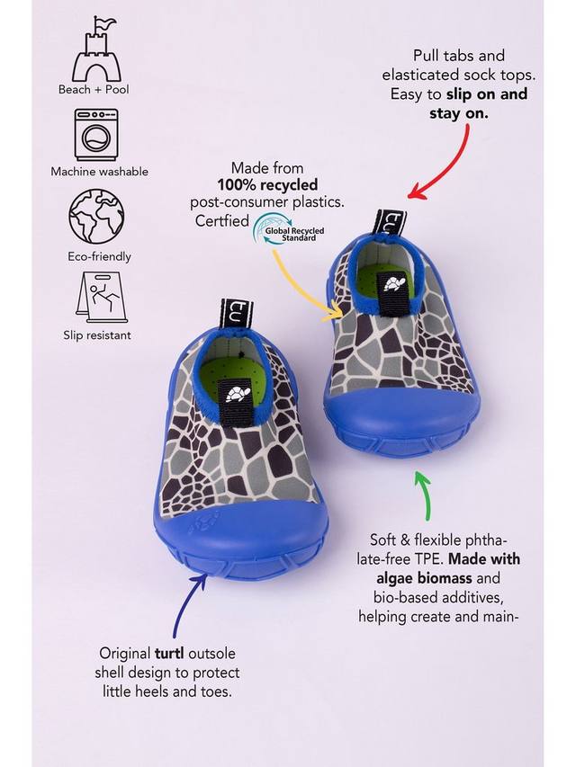 Идеальное решение для безопасности и комфорта маленьких ножек: акваобувь Turtl можно полностью погружать как в пресную, так и в соленую воду. Верх защищает ноги от солнца, а подошва нескользящая.