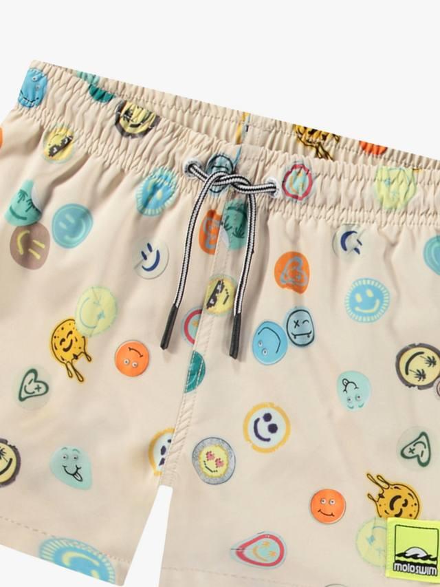 Плавки свободного кроя, до середины бедра, с простым задним карманом, эластичным поясом на шнурке и мягкими сетчатыми внутренними шортами. Плавки бежевого цвета с ярким принтом улыбающихся лиц по всей поверхности.