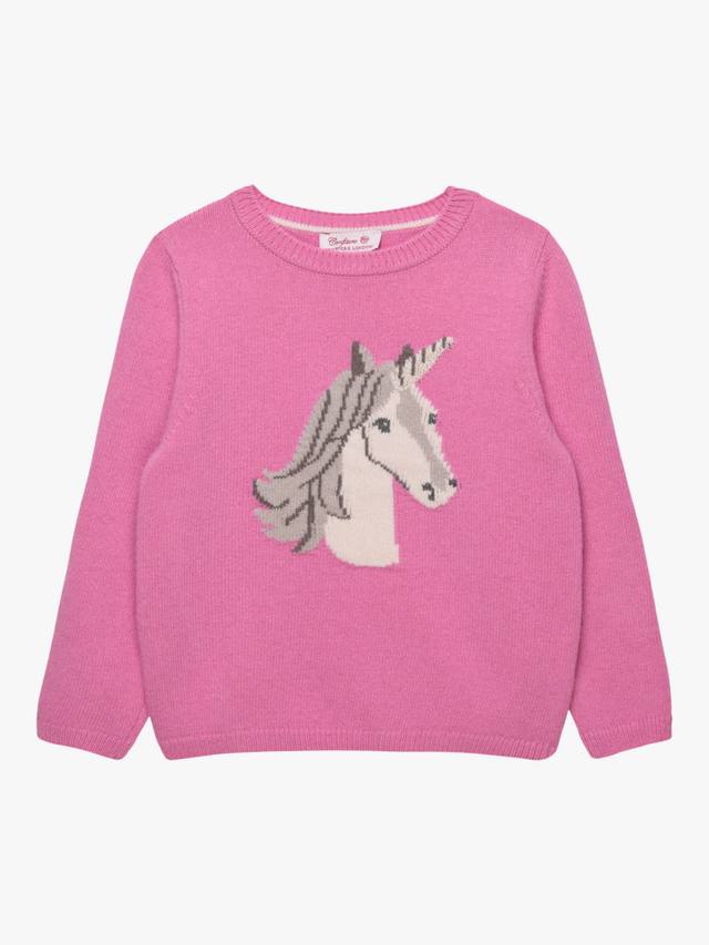 Этот джемпер украшен спереди волшебным рисунком единорога в технике интарсии, а также дополнен металлической нитью на роге.