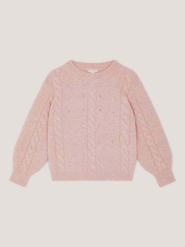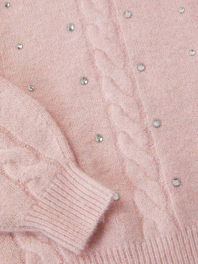 Этот джемпер связан из супермягкой пряжи с панелями из косичной вязки и украшен серебряными стразами для создания блестящего эффекта.