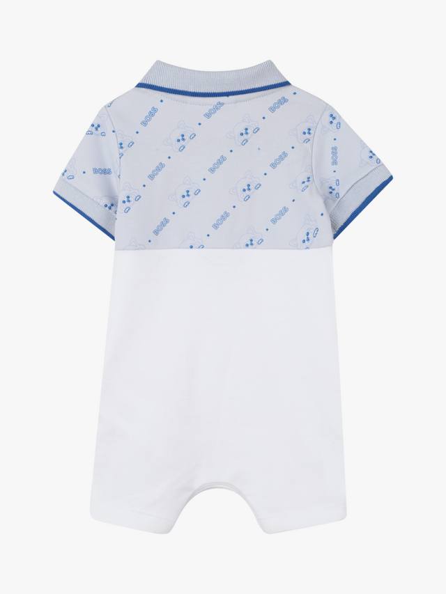 Этот короткий комбинезон изготовлен из 100% хлопка с контрастной кокеткой в верхней части с принтом монограммы панды по всему телу, полосатым воротником-поло, планкой и манжетами рукавов.
