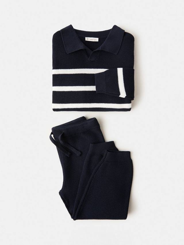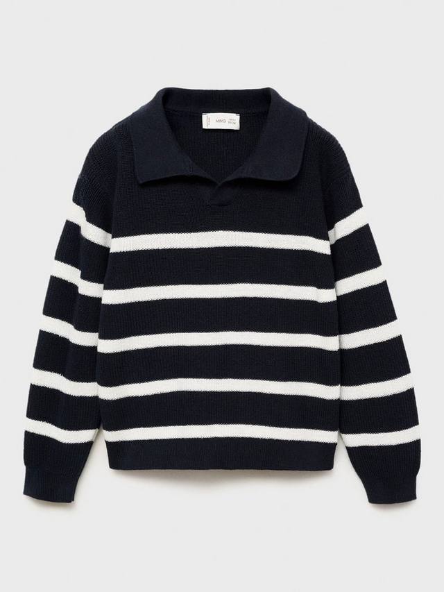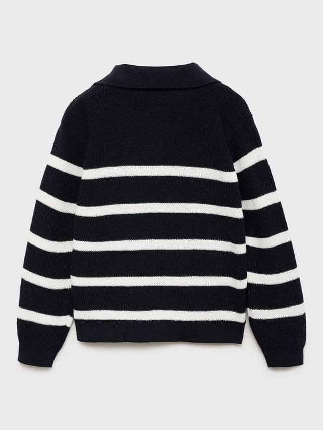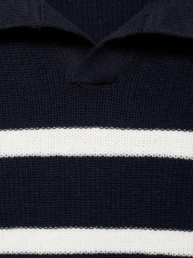 Плотный трикотажный джемпер в полоску с ребристым воротником-поло, манжетами и подолом.