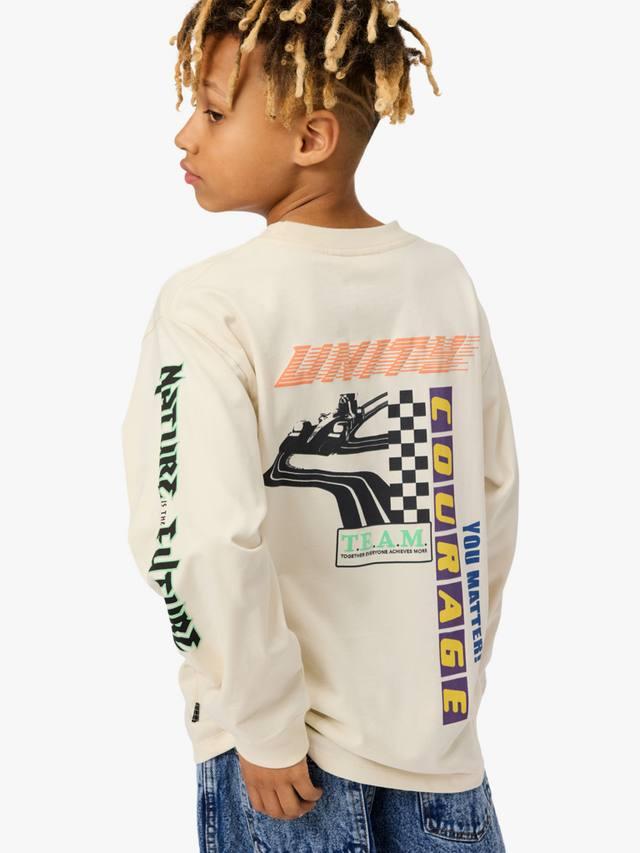 Топ бежевого цвета из органического хлопка с длинными рукавами, круглым вырезом, ребристой отделкой по горловине и рукавам. Свободный крой и разноцветный принт по всей поверхности.