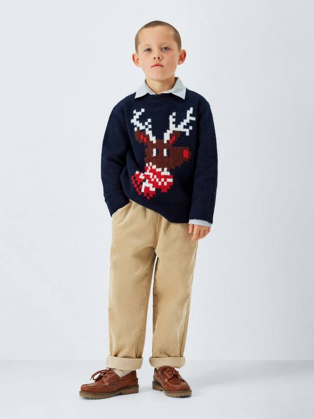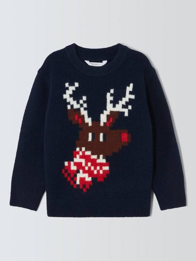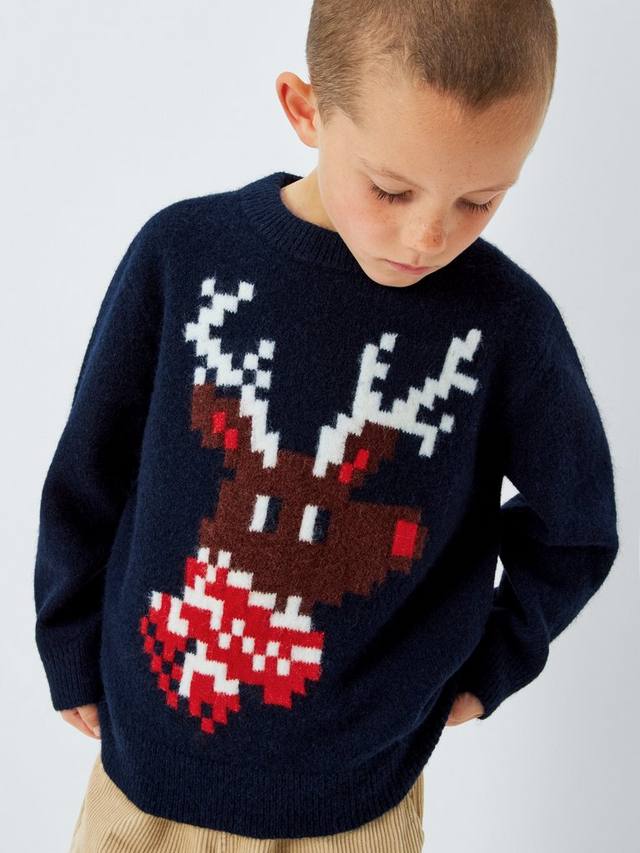 Классический свитер с круглым вырезом и пиксельным рисунком оленей.