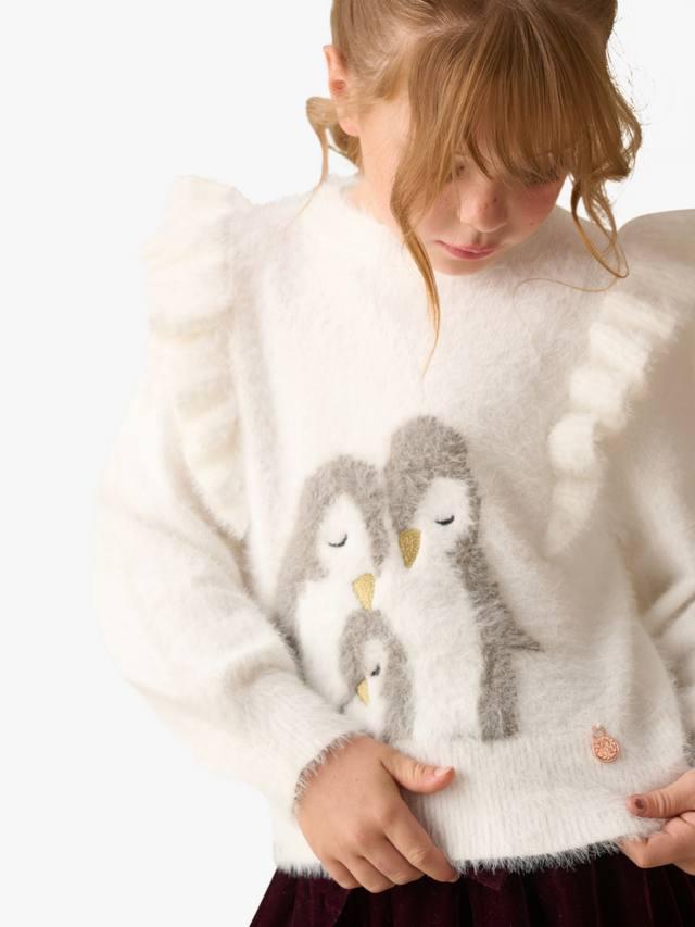Вы будете в восторге от этой зимней вязаной вещи. Она изготовлена из мягчайшей пряжи с ресничками и украшена очаровательными оборками на плечах. Она украшена изображением уютной семьи пингвинов, идеально подходящей для праздничного сезона. Она гарантированно растопит ваши сердца — даже в снег.