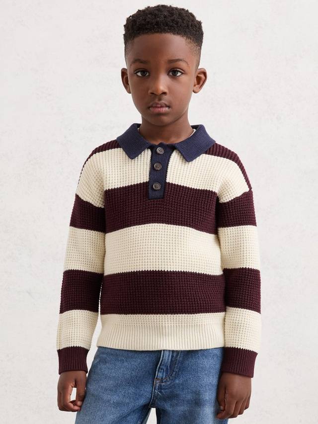 Джемпер Hatfield выполнен из уютной хлопковой ткани с текстурированной вафельной вязкой. Широкие полосы в стиле регби сочетаются с контрастным воротником-поло и короткой планкой с пуговицами, а ребристая отделка аккуратно завершает дизайн.