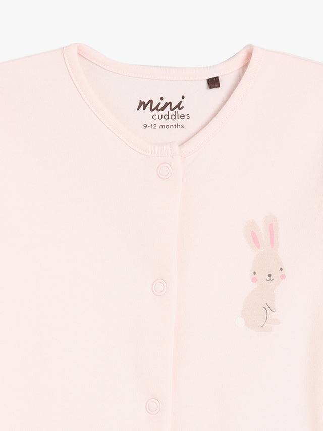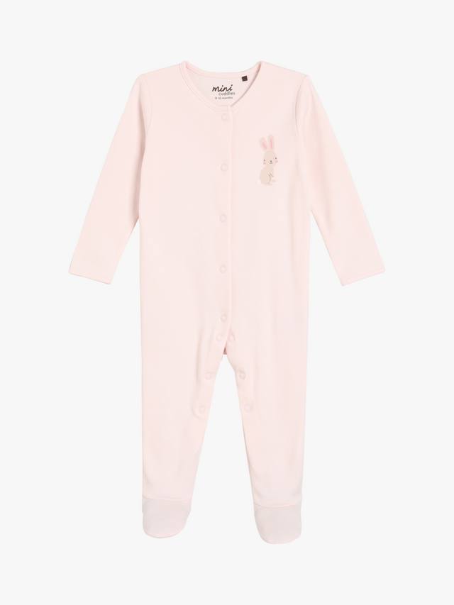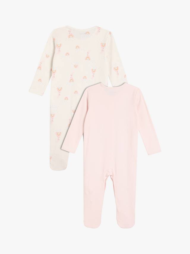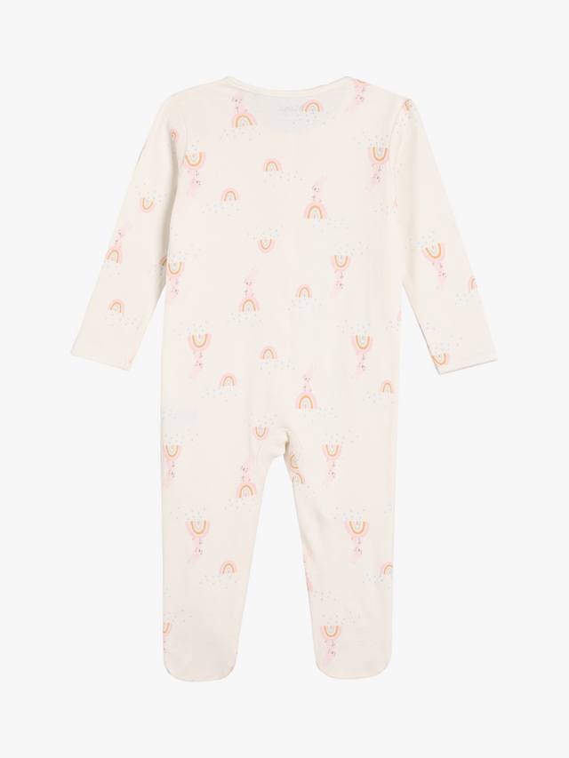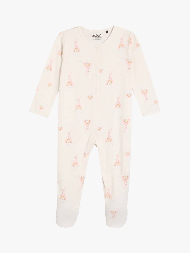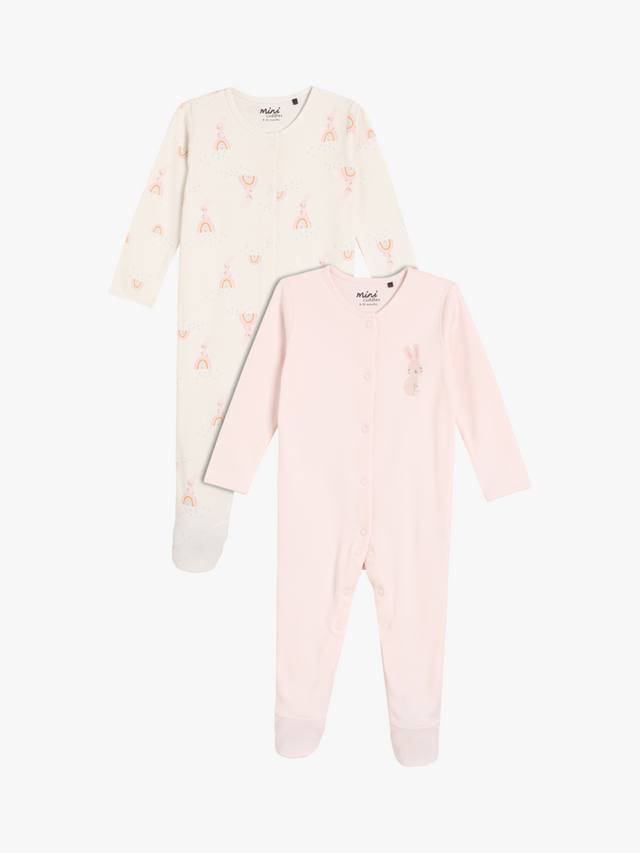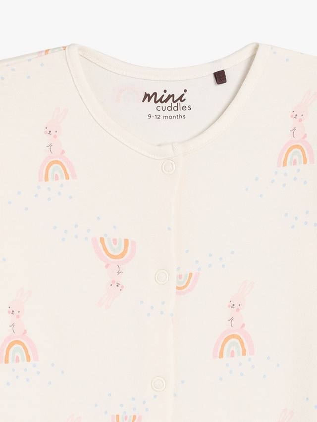 Этот комплект из двух пижам, выполненных из супермягкой трикотажной пряжи с начесом в рубчик, украшен очаровательным принтом в виде кролика и радуги по всей поверхности, а также однотонным нежно-розовым принтом с изображением кролика на груди. Передние застежки-кнопки позволяют легко переодеваться, а вшитые варежки-царапки на моделях меньшего размера защищают маленькие ручки.