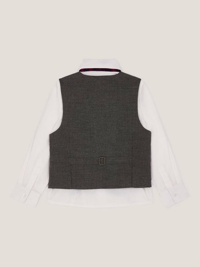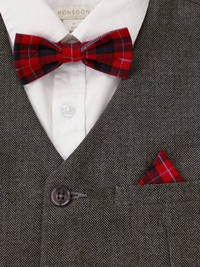 Комплект из 3 предметов: рубашка из плотного хлопка, серый жилет и красный галстук-бабочка в клетку, подходящий к нагрудному платку.