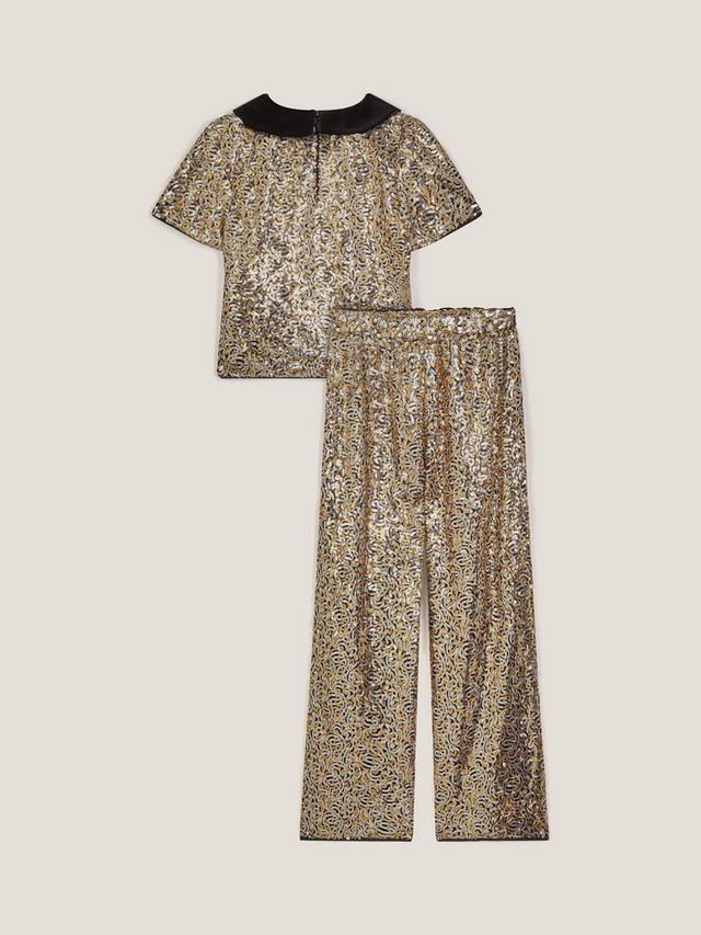 Этот комплект, усыпанный мерцающими пайетками, состоит из топа с короткими рукавами и брюк, которые гарантированно сверкают в свете диско-фонарей. Этот наряд, дополненный бархатным воротником и декоративным бантом для контрастного эффекта, будет прекрасно сочетаться с маленькими черными туфлями на каблуке.