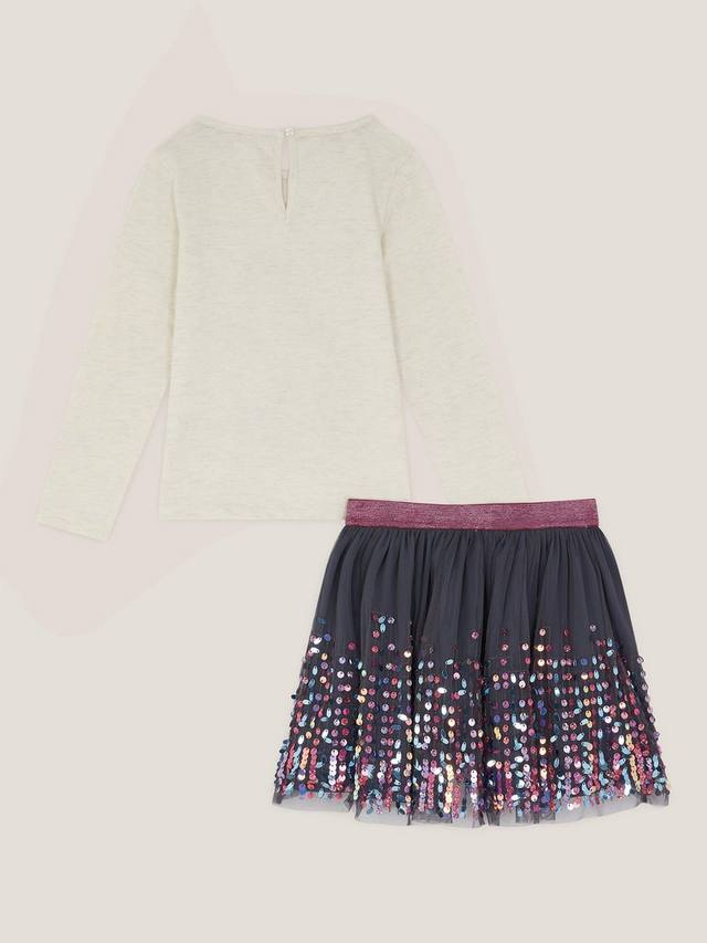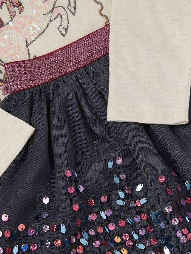 Для малышей, которые любят единорогов и блестки. Этот комплект включает в себя топ с длинными рукавами и принтом в виде единорога из пайеток спереди, а также юбку-пачку из сетки, расшитую разноцветными пайетками.
