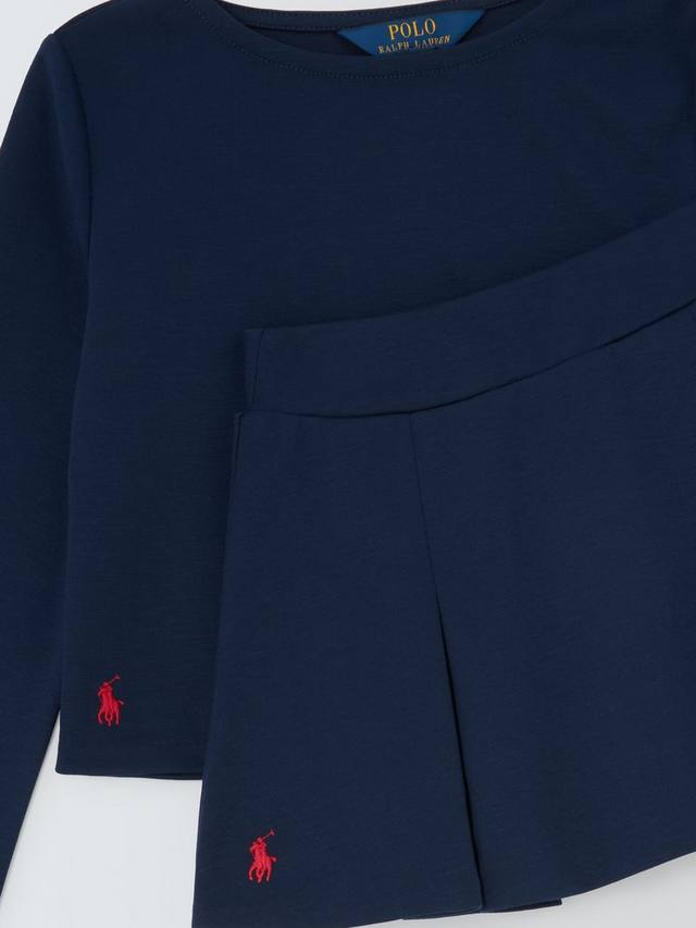 Этот комплект, воплощающий классический стиль Ralph Lauren, включает в себя топ с круглым вырезом и длинными рукавами, а также юбку в тон с изящной плиссировкой по подолу. Модель украшена фирменной вышивкой Polo.