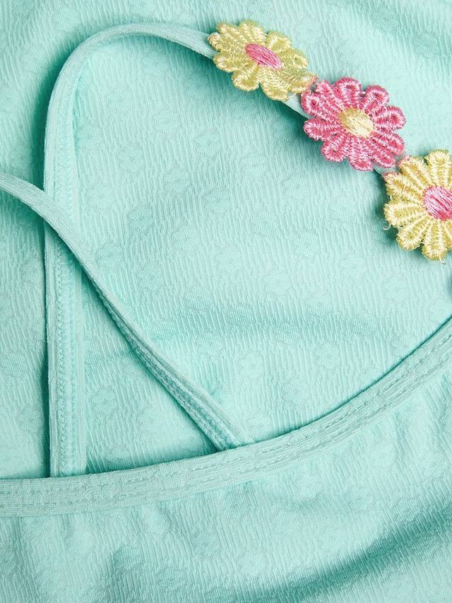 Окунитесь в мир веселья в этом купальнике с очаровательными мелкими цветочками на перекрещивающихся сзади бретельках. Он выполнен из мягкой и эластичной ткани для плавания и имеет яркий аквамариновый оттенок.