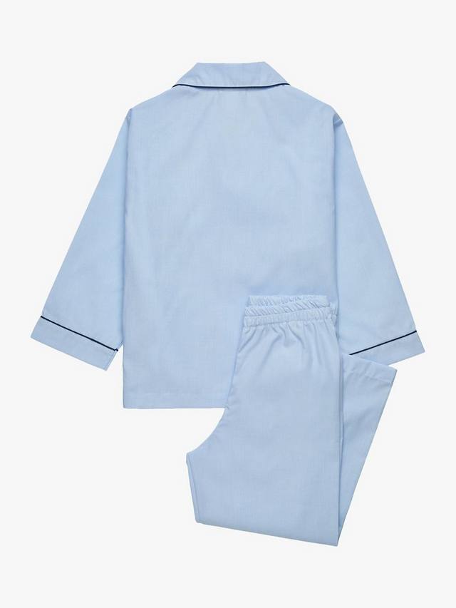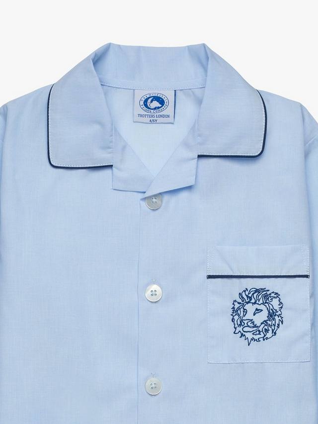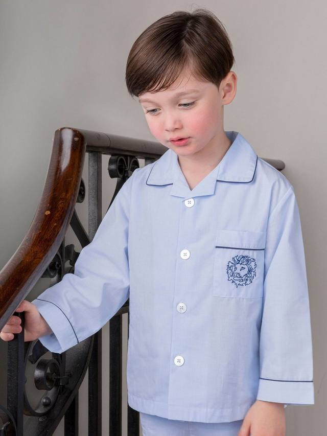 Эта пижама из 100% хлопка с длинными рукавами и контрастной окантовкой застегивается на пуговицы с перламутровым блеском и украшена вышитым на нагрудном кармане фирменным львом Августа. Брюки с полностью эластичной талией идеально подходят для сладких снов и комфортного сна.