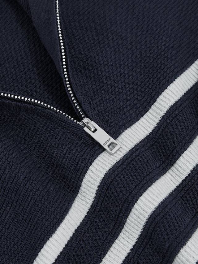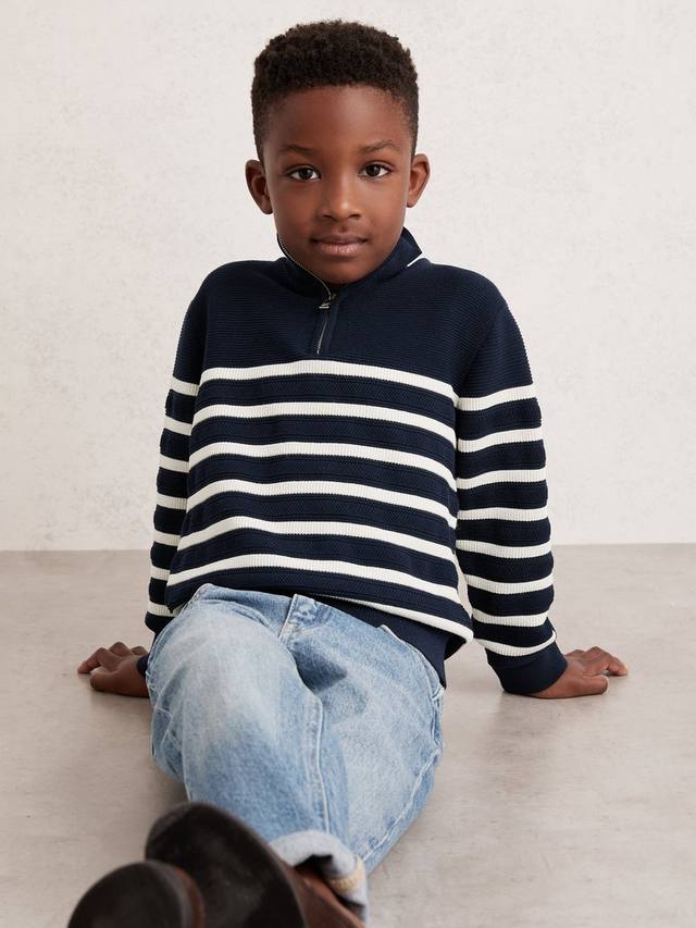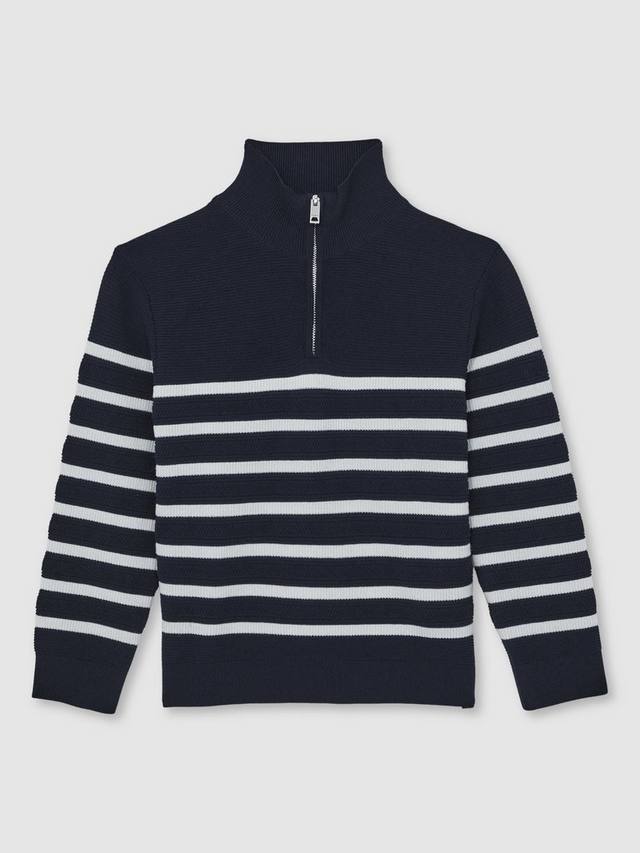 Этот полосатый джемпер с застежкой-молнией на воротнике сочетает в себе комфорт и неповторимый стиль, что делает его идеальным вариантом для многослойной одежды в напряженные дни.
