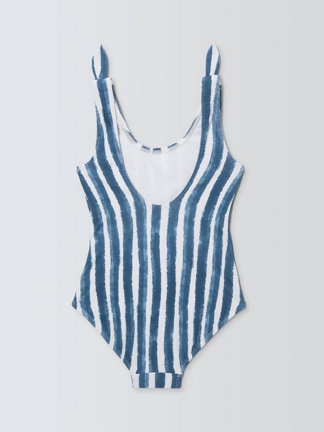 Полосатый купальник с узелками на плечах и глубоким вырезом на спине.