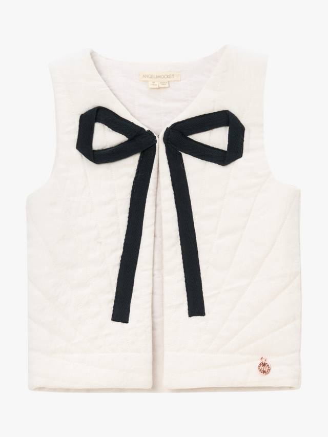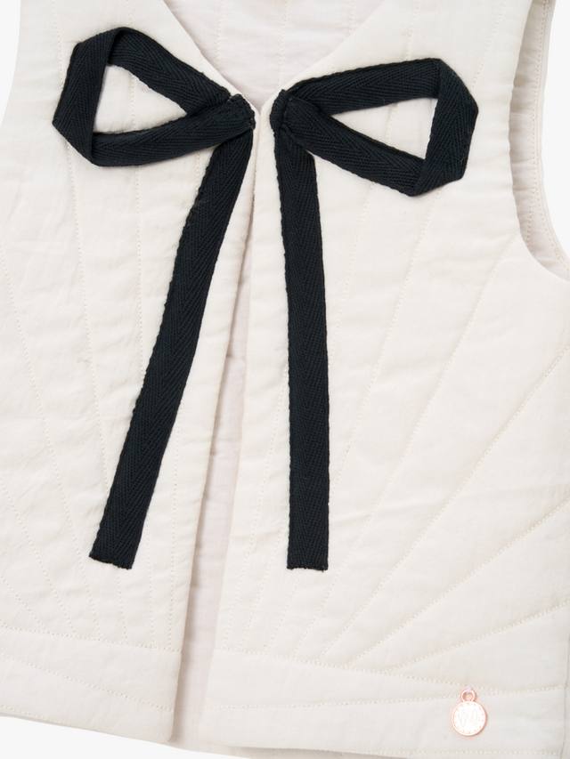 Этот жилет просто невероятен. Стеганый, утеплённый жилет цвета слоновой кости с большим контрастным бантом идеально подходит для многослойной одежды, добавляя тепло и очарование любому образу.