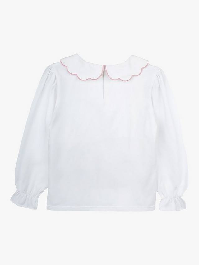 В этом сезоне классическая трикотажная блузка приобрела изящную нотку благодаря красивой вышивке вдоль воротника с фестончатыми краями. Этот простой и элегантный трикотажный топ застегивается на пуговицы по всей длине спинки и имеет эластичные манжеты. Он идеально подходит для ношения под вашим любимым трикотажем, создавая элегантный образ.