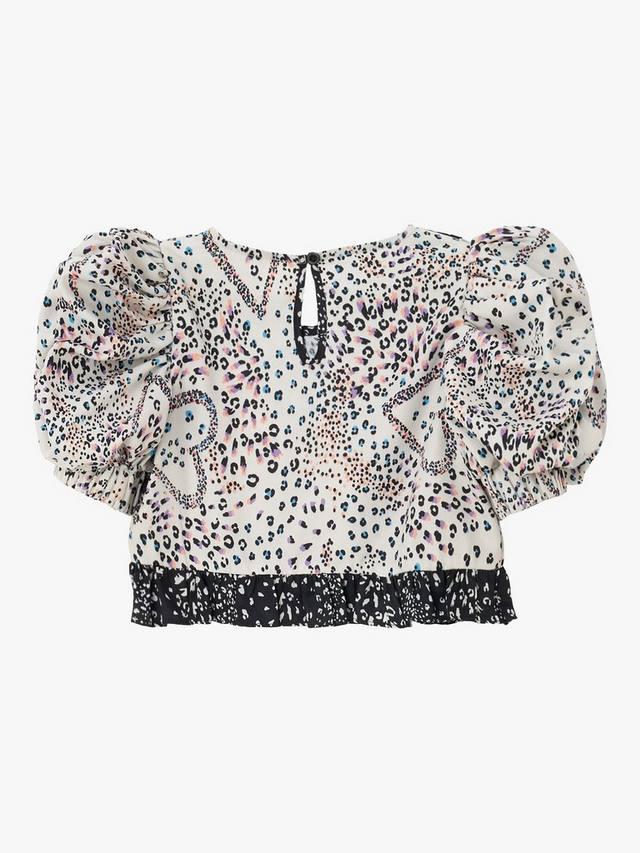 Этот эффектный топ украшен игривыми оборками, ярким анималистичным принтом и рукавами-буфами.