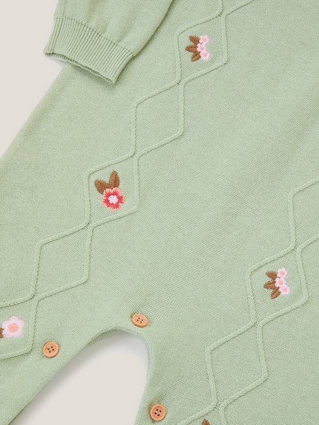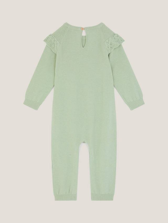 Милый и уютный комбинезон связан узором косички нежно-зеленого цвета. Он украшен вышитыми мелкими цветочными узорами, ажурными оборками и застежкой на пуговицы для удобства надевания.