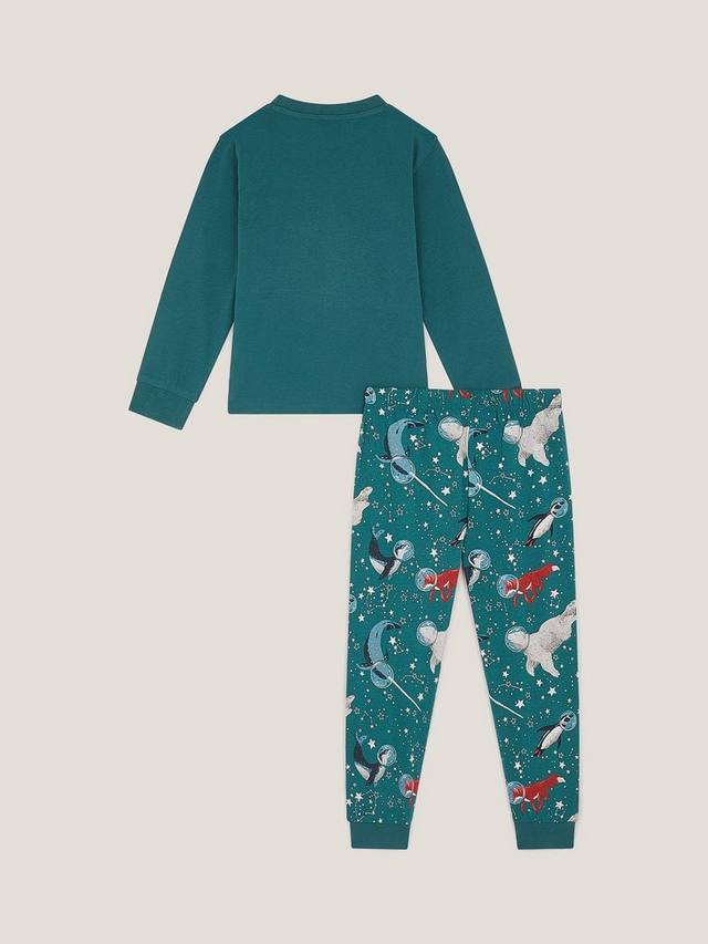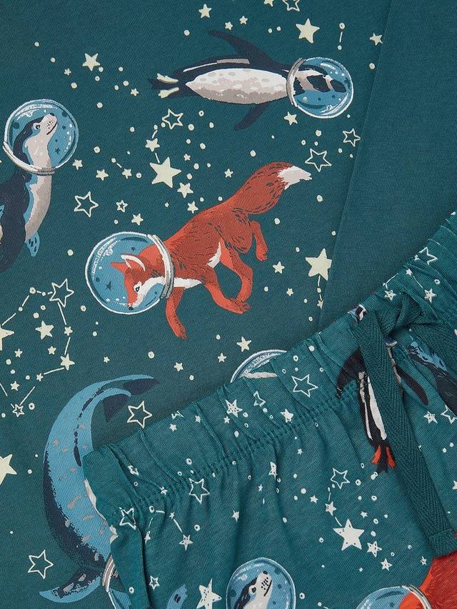Эта пижама из мягкого хлопка украшена изображениями животных-космонавтов, парящих среди созвездий и падающих звёзд. А ещё она светится в темноте.