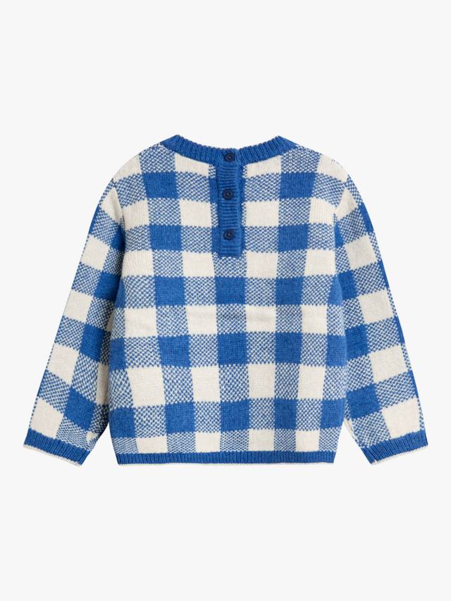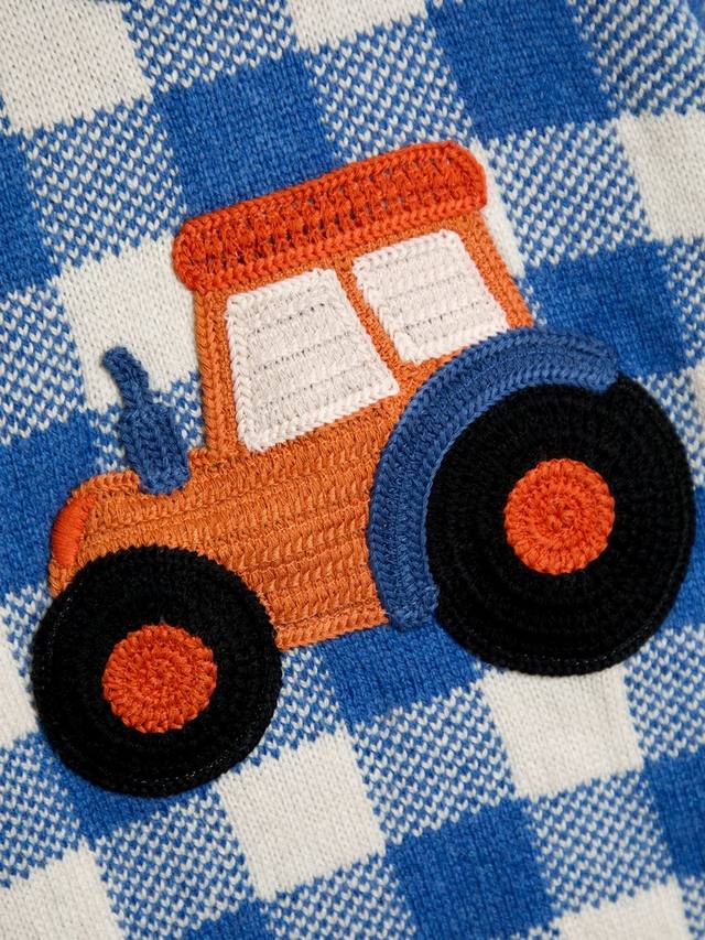 Отправляйтесь навстречу приключениям в этом джемпере с аппликацией в виде трактора и синим принтом в клетку, который будет выделяться в крошечном гардеробе. Изготовлен из мягкой шерстяной смеси и застегивается на пуговицы сзади для удобства надевания.