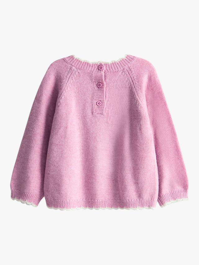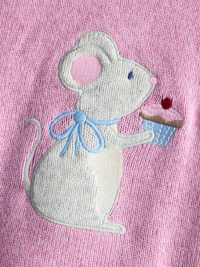 Этот джемпер украшен фестончатой отделкой по вырезу, подолу и манжетам, придающей ему изящный вид. Он дополнен очаровательной аппликацией в виде мышки с кексом спереди. Мягкая, приятная на ощупь ткань и длинные рукава делают этот джемпер идеальным вариантом для прохладных дней.