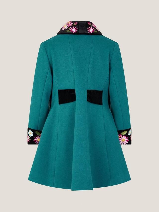 Это пальто станет ярким дополнением к зимнему гардеробу. Оно выполнено в ярком бирюзовом цвете с контрастными бархатными вставками и цветочной вышивкой. Двубортный жакет застёгивается на пуговицы спереди.