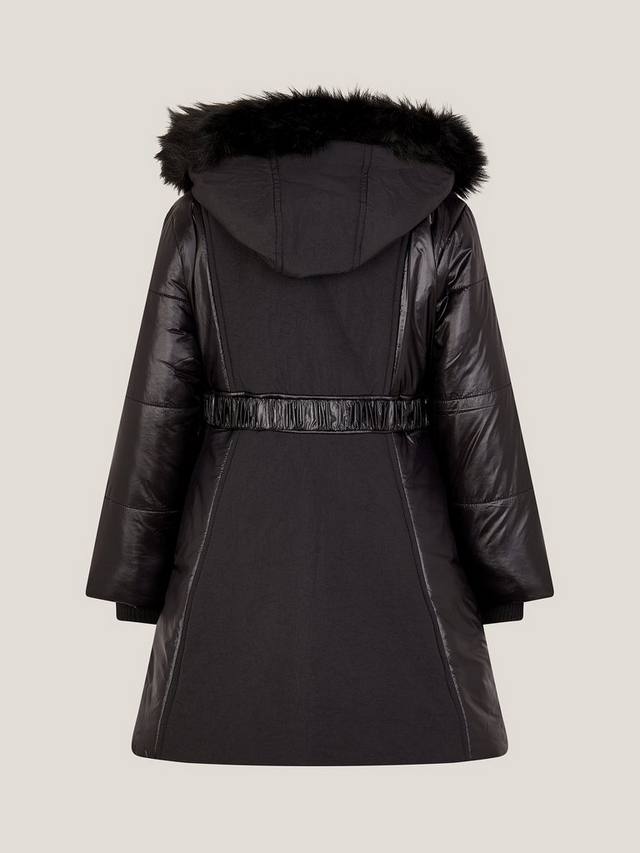 Это пальто А-силуэта из контрастной матовой ткани дополнено невероятно мягкой отделкой из искусственного меха на капюшоне. Оно будет уютным и стильным как для похода в школу, так и для других занятий.