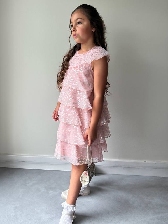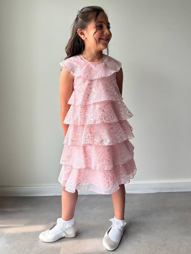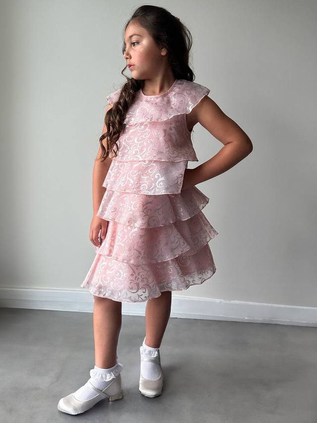 Платье для особых случаев с многоярусными оборками до колена. Украшено мерцающим металлическим узором, который будет сверкать на танцполе.