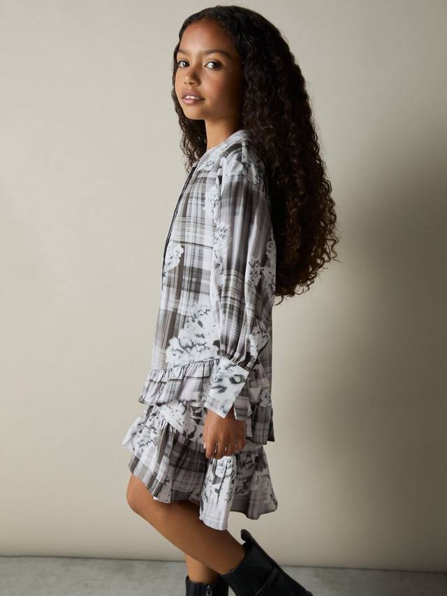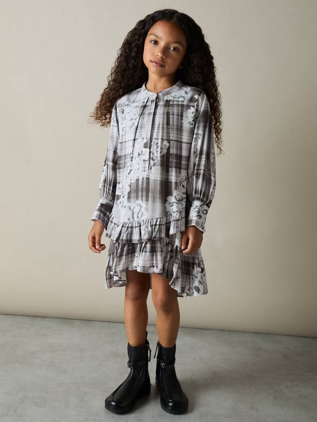 Это платье с длинными рукавами в цветочную клетку от Reiss, сочетающее в себе два самых любимых принта, создано из вискозы, что обеспечивает лёгкий и воздушный образ. Платье украшено множеством асимметричных оборок и рюшей по подолу, что делает его готовым к любым приключениям.