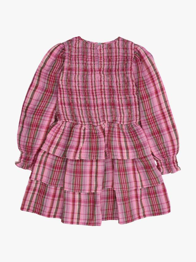 Короткое клетчатое платье из двойной газовой ткани с присборенным лифом, эластичным поясом и тремя оборками на юбке. Сзади – вырез-капелька с застежкой на пуговицы.