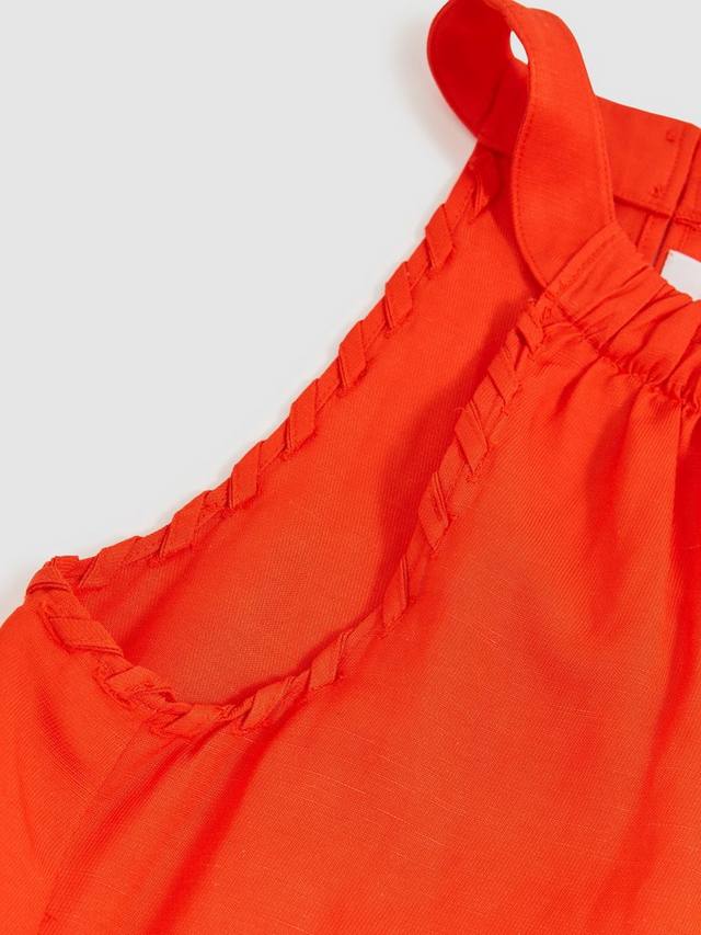 Платье Erika выполнено с добавлением льна, что обеспечивает лёгкость и воздушность. Присборенный вырез переходит в мягкий расклешенный силуэт, обеспечивая непринуждённость движений. Тональная обметка на проймах добавляет нотку ручной работы гладкому тканому дизайну. Льняная обметка, присборенный вырез, боковые карманы, застежка на пуговицу с замочной скважиной и молнией сзади.