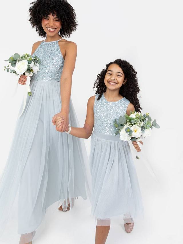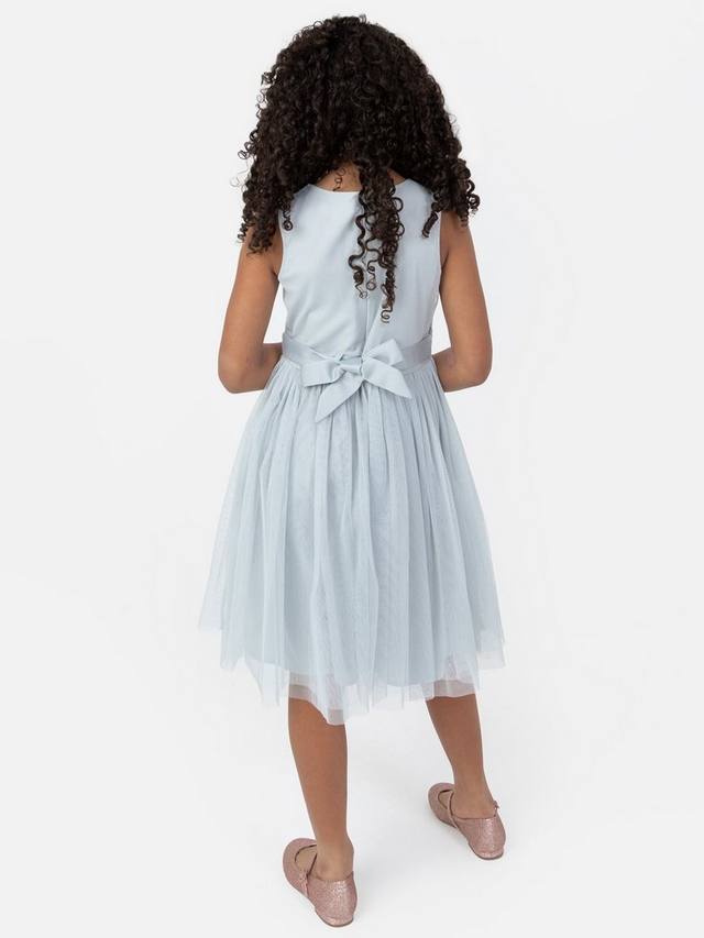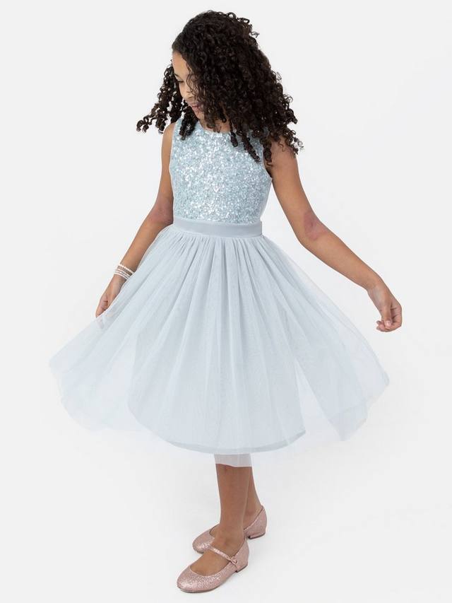 Это платье миди идеально подходит для особых случаев и обещает день бесконечных кружений. Круглый вырез на лифе без рукавов украшен мерцающими пайетками и покрыт мягкой фатином для защиты нежной кожи. Пояс из атласной ленты завязывается на спине красивым бантом, добавляя очаровательную нотку. Дополните это платье миди блестящими туфлями и повязкой на голову, чтобы создать волшебный, завораживающий, сказочный образ.