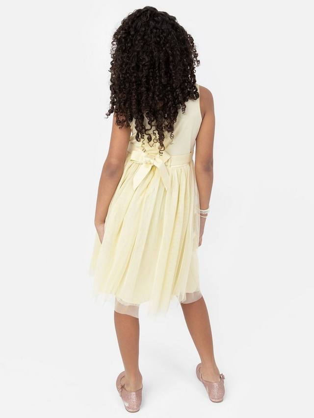 Это платье миди идеально подходит для особых случаев и обещает день бесконечных кружений. Круглый вырез на лифе без рукавов украшен мерцающими пайетками и покрыт мягкой фатином для защиты нежной кожи. Пояс из атласной ленты завязывается на спине красивым бантом, добавляя очаровательную нотку. Дополните это платье миди блестящими туфлями и повязкой на голову, чтобы создать волшебный, завораживающий, сказочный образ.
