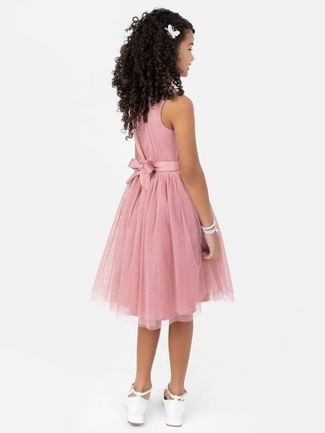 Это платье миди идеально подходит для особых случаев и обещает день бесконечных кружений. Круглый вырез на лифе без рукавов украшен мерцающими пайетками и покрыт мягкой фатином для защиты нежной кожи. Пояс из атласной ленты завязывается на спине красивым бантом, добавляя очаровательную нотку. Дополните это платье миди блестящими туфлями и повязкой на голову, чтобы создать волшебный, завораживающий, сказочный образ.