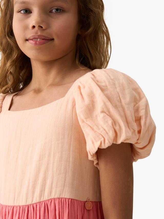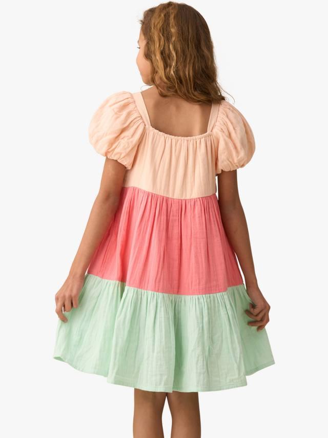 Создайте стильное многоярусное платье с цветовыми блоками! Платье выполнено из мягкой фактурной ткани в свежих летних цветах и дополнено эффектными рукавами-буфами для игривого и модного образа.