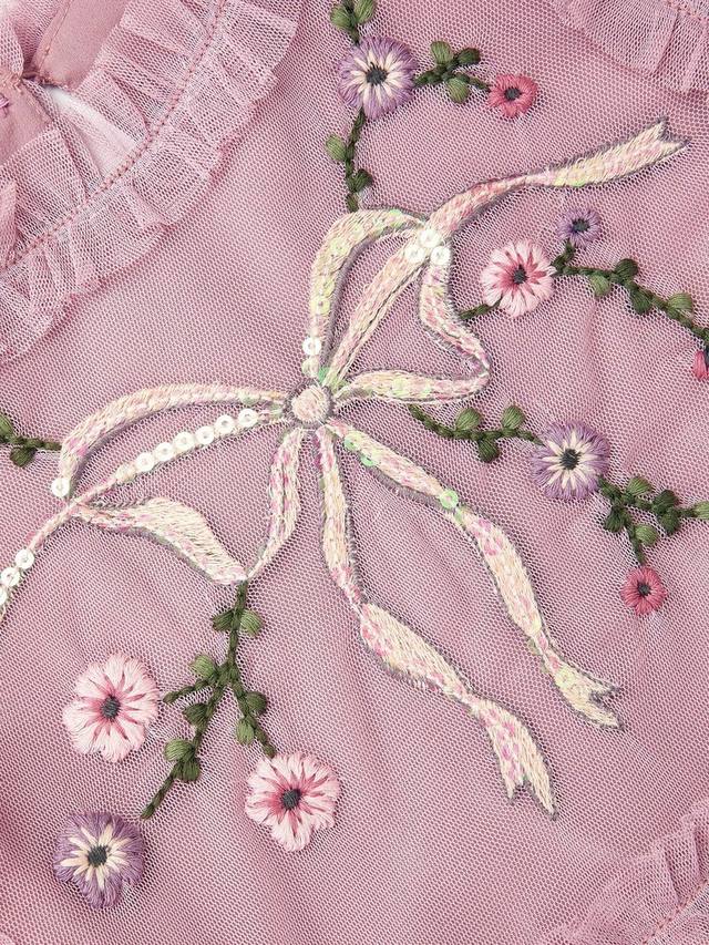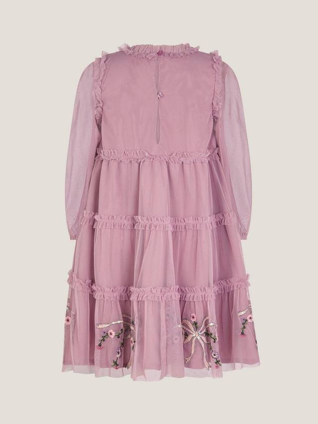 Это платье с длинными рукавами и оборками украшено бантами из пайеток и цветочной вышивкой.