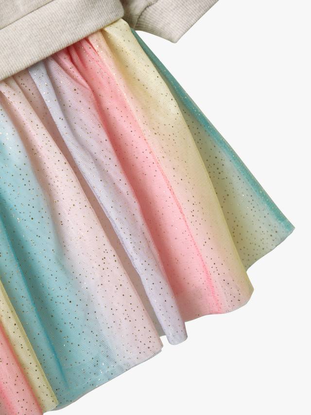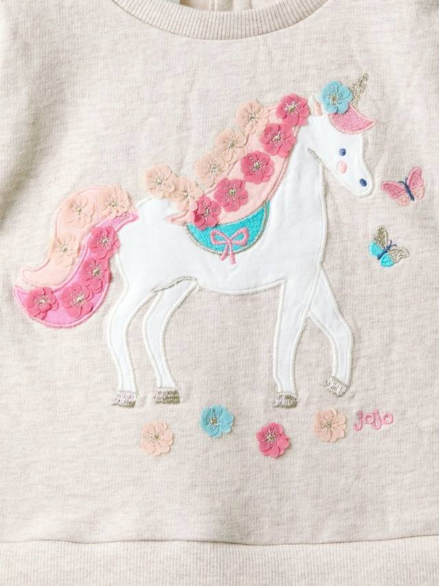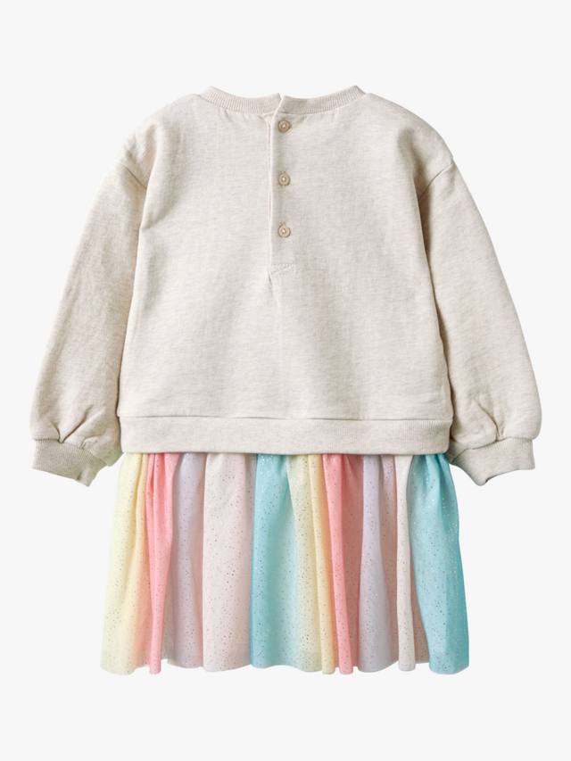 Это платье с уютным верхом-свитшотом, украшенным единорогом в цветочной короне и порхающими бабочками, идеально подходит для маленьких фантазий. Платье дополнено пришитой юбкой из струящегося тюля.