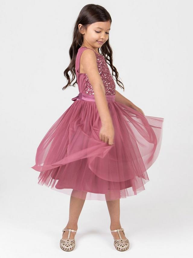 Это платье миди идеально подходит для особых случаев и обещает день бесконечных кружений. Круглый вырез на лифе без рукавов украшен мерцающими пайетками и покрыт мягкой фатином для защиты нежной кожи. Пояс из атласной ленты завязывается сзади красивым бантом, добавляя очаровательную нотку. Дополните это платье миди сверкающими туфлями и повязкой на голову, чтобы создать волшебный, завораживающий, сказочный образ.