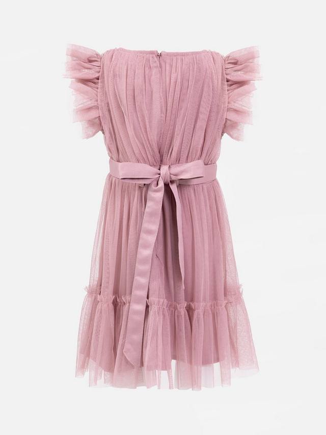 Это очаровательное платье миди из мягкого тюля идеально подходит для особых случаев, от свадьбы до дня рождения. Изящная оборка образует едва заметный рукав-крылышко, а атласный пояс, завязывающийся на спине элегантным бантом, добавляет образу ещё больше очарования. Мягкая подкладка обеспечивает комфорт в течение всего дня. Дополните ансамбль сверкающими туфлями и золотым оголовьем для создания изысканного, но очаровательного образа.
