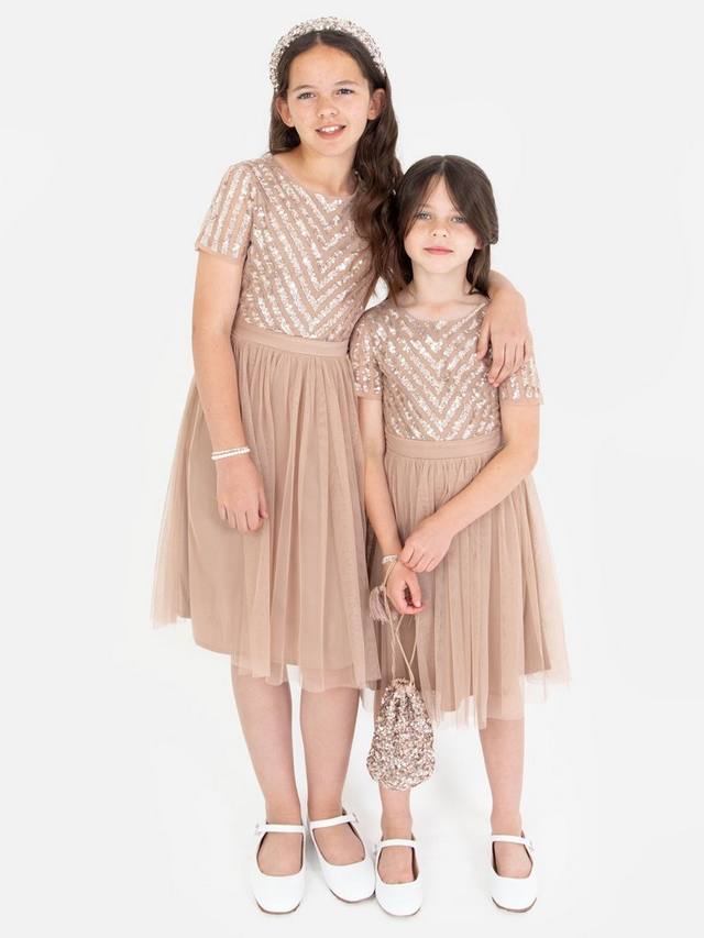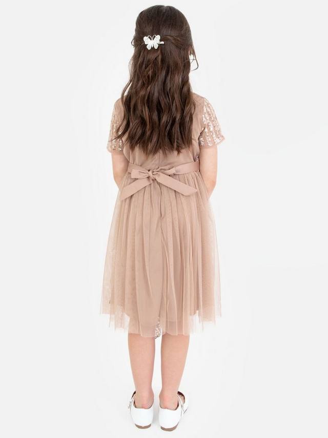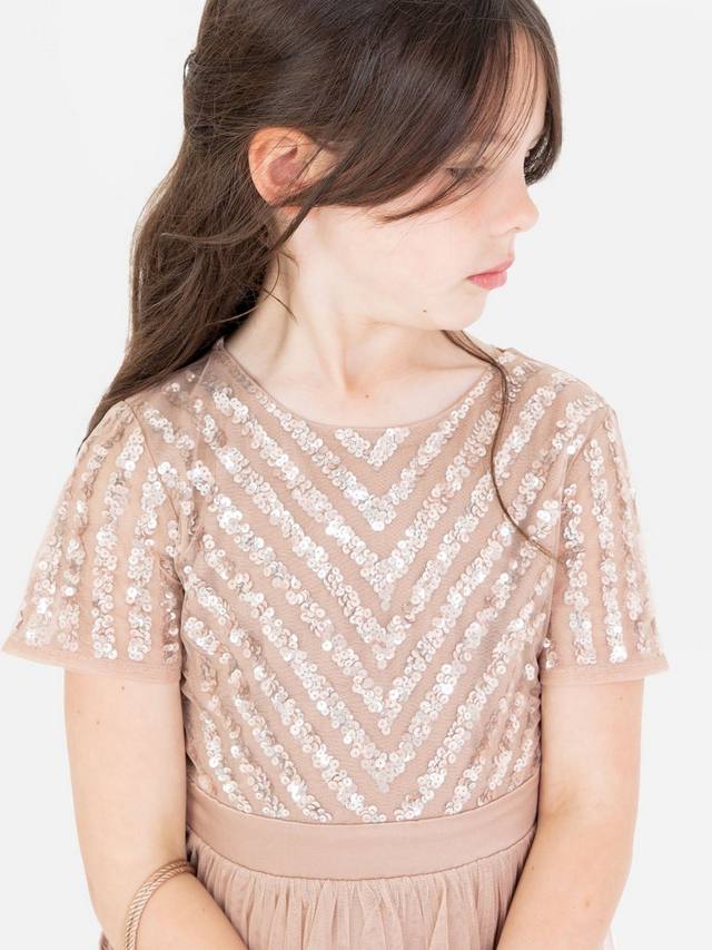 Это платье миди идеально подходит для особых случаев и обещает день бесконечных кружений. Оно украшено обилием мерцающих пайеток ручной работы, ниспадающих с круглого выреза и коротких рукавов-крылышек, мягко рассыпающихся по присборенной юбке миди. Оборки на рукавах и юбке придают образу принцессы. Дополните это платье серебристыми туфлями и сверкающей повязкой на голову.