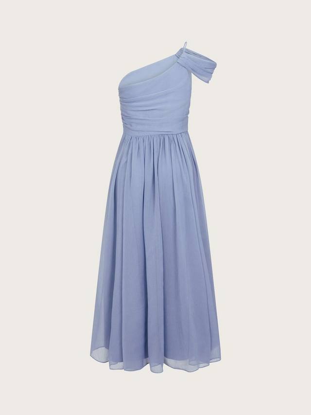 Это платье, выполненное из струящегося шифона, имеет симпатичный лиф на одно плечо со сборками, а также длину миди с плиссировкой на юбке. Простые драпированные рукава добавляют гламура и идеально подходят для особых случаев.