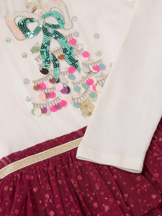 Это платье в стиле диско украшено пайетками в виде рождественской ёлки на лифе с длинными рукавами и юбкой из тюля с блестками. Вырез горловины дополнен оборкой из тюля, а сзади застёжка на пуговицы для удобства надевания.